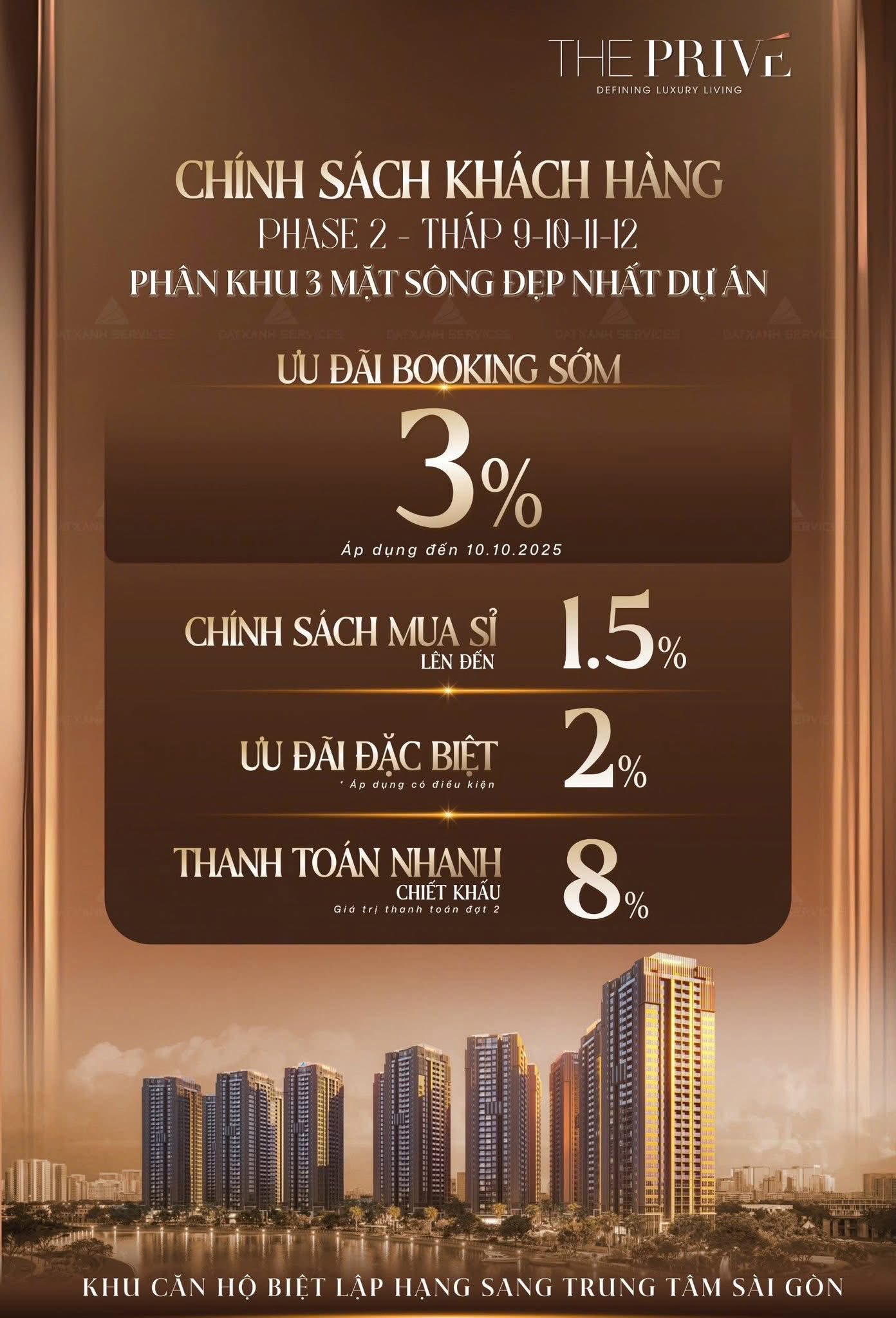 - Chiết khấu Booking Sớm (Tối đa 3%): Dành cho khách hàng quyết định nhanh chóng, mức chiết khấu giảm dần theo thời gian. Đặt chỗ trước ngày 10/10/2025 để nhận ưu đãi cao nhất là 3%.