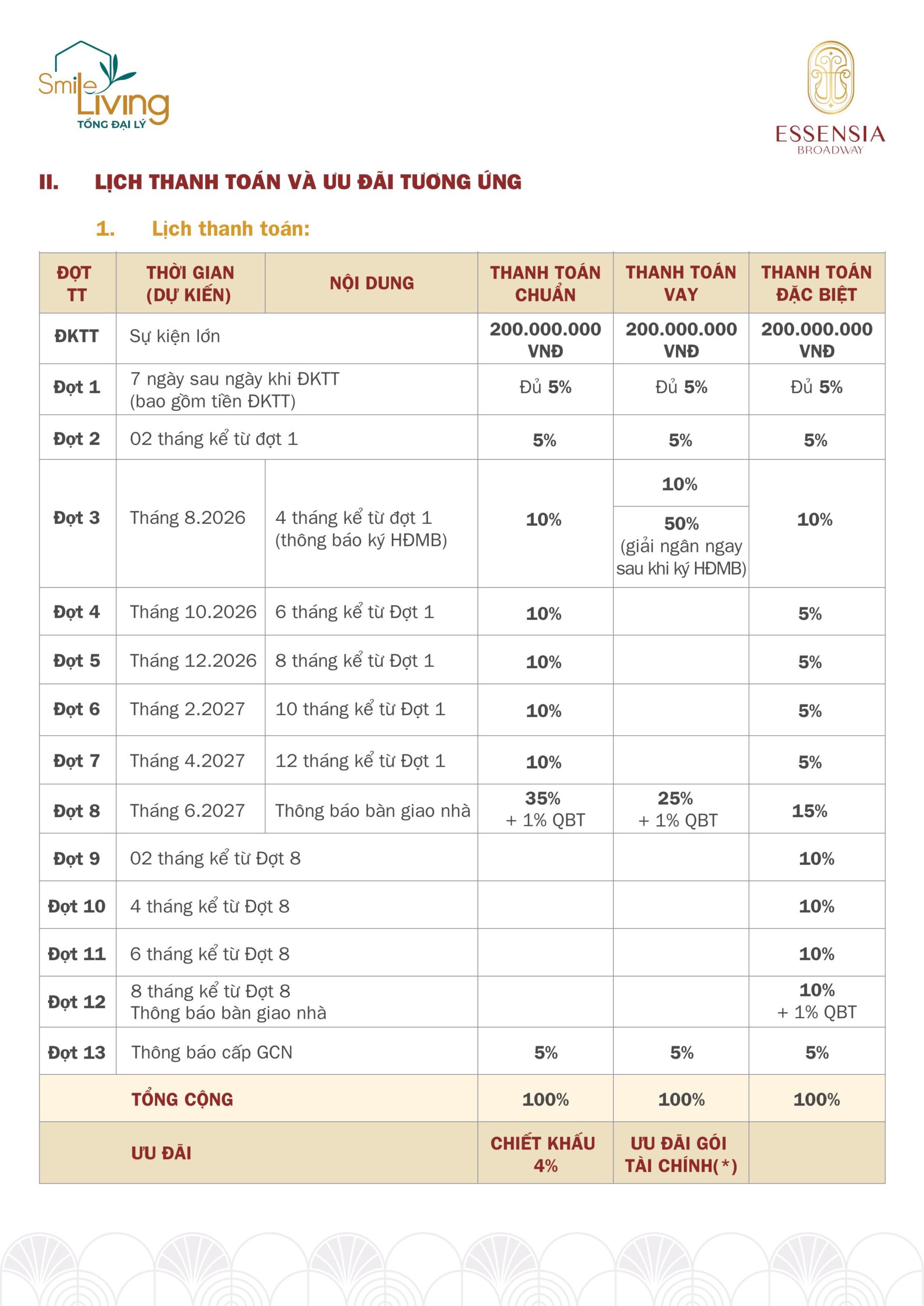 Chính sách bán hàng Essensia Broadway 2025 được đánh giá là một trong những chương trình ưu đãi hấp dẫn nhất khu Nam dành cho khách hàng đăng ký sớm. Theo quy định áp dụng từ ngày 04/12/2025, người mua sẽ được thụ hưởng nhiều quyền lợi giá trị, từ ưu đãi tài chính đến quà tặng tri ân, giúp tối ưu chi phí sở hữu và an cư.