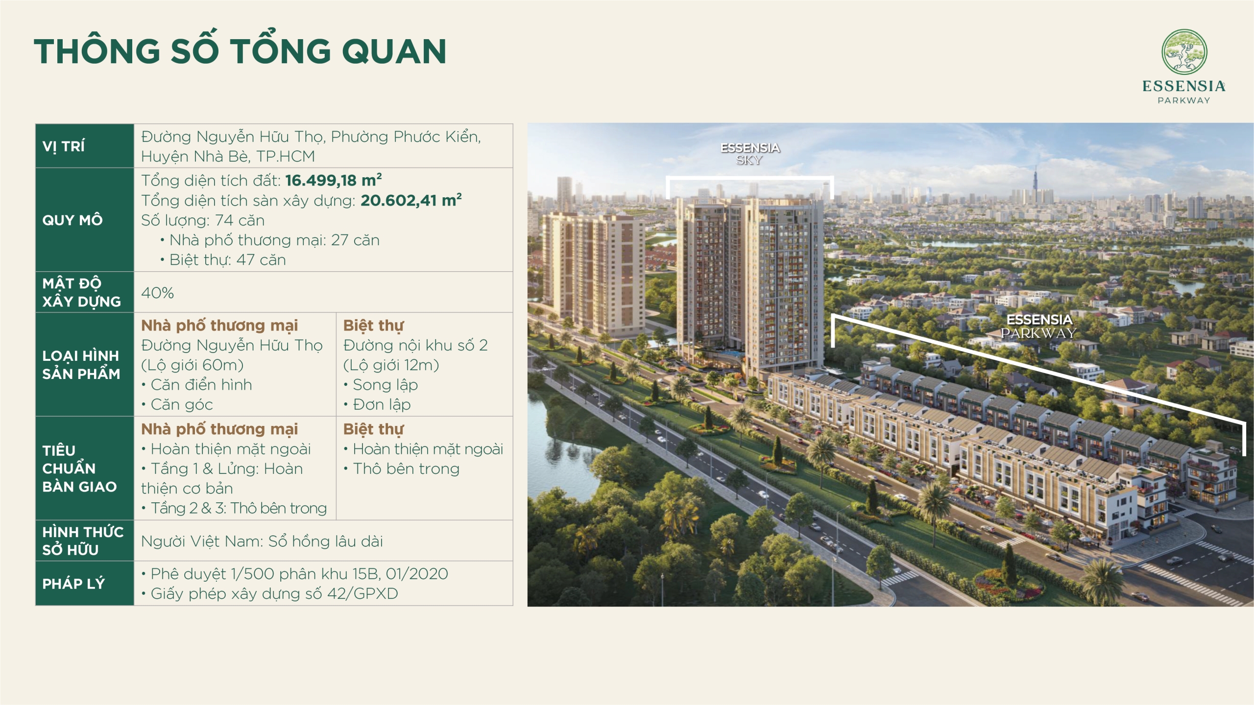 Dự án Essensia Parkway sở hữu vị trí vàng mặt tiền đường Nguyễn Hữu Thọ, xã Phước Kiểng, Q. Nhà Bè, TP.HCM được phát triển bởi chủ đầu tư vô cùng uy tín Phú Long trong tổng quy mô 16.499,18m2. Với chủ trương phát triển các dự án ra các khu vực lân cận của TP.HCM thì Essensia Parkway là một trong những dự án nổi bật nhất tại khu vực phía Nam thành phố.