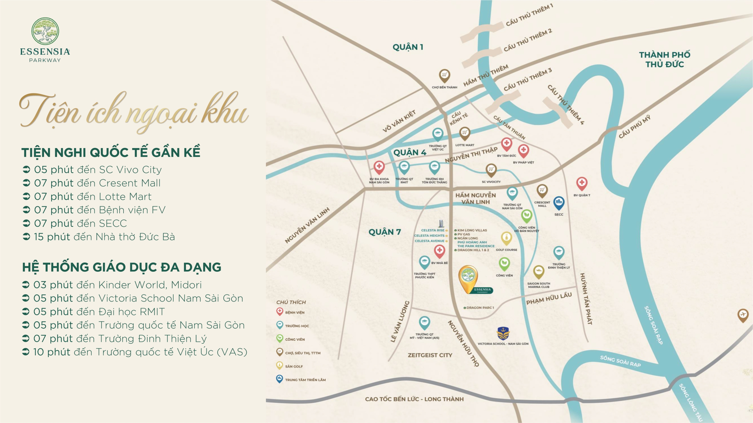 Nằm trên trục đường Bắc Nam – Nguyễn Hữu Thọ, tuyến giao thông huyết mạch kết nối các tỉnh miền Tây và cách trung tâm TP.HCM chỉ 15 phút, Essensia Parkway sở hữu vị trí vàng tại vùng xanh sôi động Nam Sài Gòn. Quy hoạch hạ tầng đồng bộ và hiện đại liền kề đô thị Phú Mỹ Hưng với những tiện ích quốc tế hàng đầu về giáo dục – y tế – thương mại chỉ trong 5 phút đi xe và chỉ 2 phút đến trạm dừng tuyến Metro số 4. Thừa hưởng và kết tinh những giá trị sống ưu việt, với muôn vàn tiện nghi ngay ngưỡng cửa: hệ thống giáo dục quốc tế từ mầm non đến đại học như SISS, BVIS, KinderWorld, Victoria School Nam Sài Gòn, đại học RMIT, đại học Tôn Đức Thắng…; hệ thống y tế cao cấp như bệnh viện quốc tế FV, viện tim Tâm Đức, các phòng khám đa khoa quốc tế… đảm bảo chất lượng chăm sóc sức khỏe tối ưu. Ngoài ra, chỉ trong bán kính 2km cũng hiện hữu đầy đủ các tiện ích tài chính, ngân hàng, các trung tâm mua sắm giải trí bậc nhất như Lotte Mart, SC VivoCity, Crescent Mall, Aeon Mall.