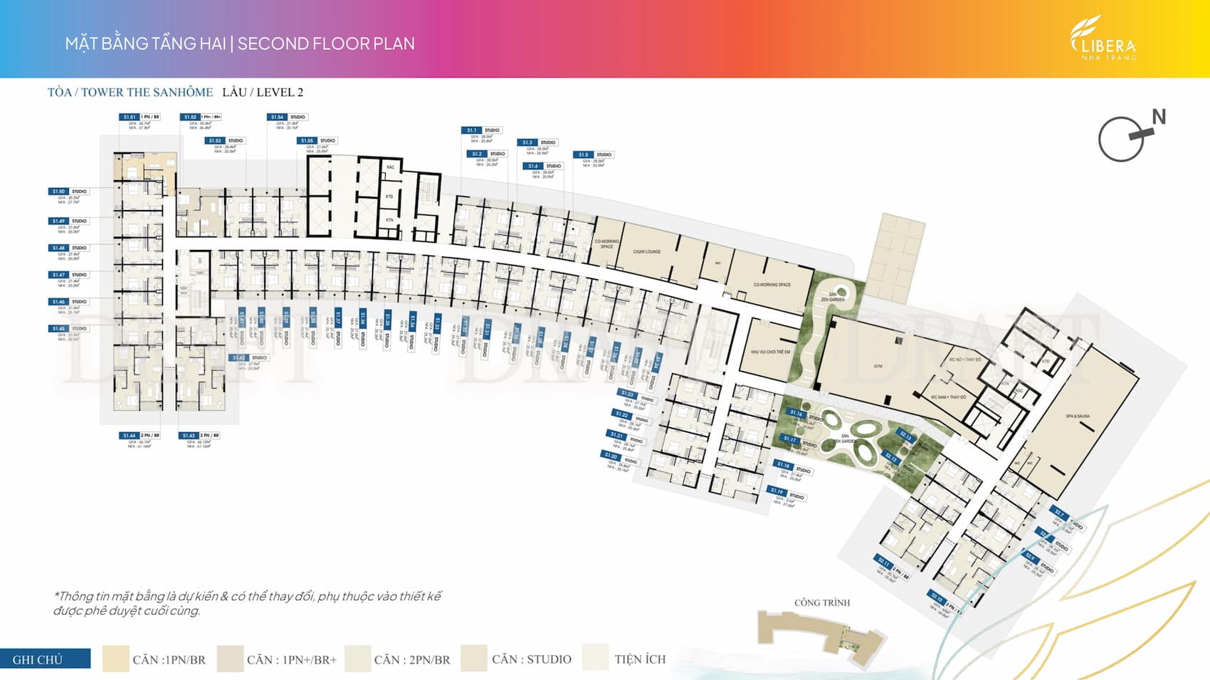 - Tầng 2: Căn hộ, Cigar Lounge & Cafe, Gym, Spa & Sauna, Văn phòng coworking, Phòng ăn, Khu vui chơi trẻ em, Zen garden