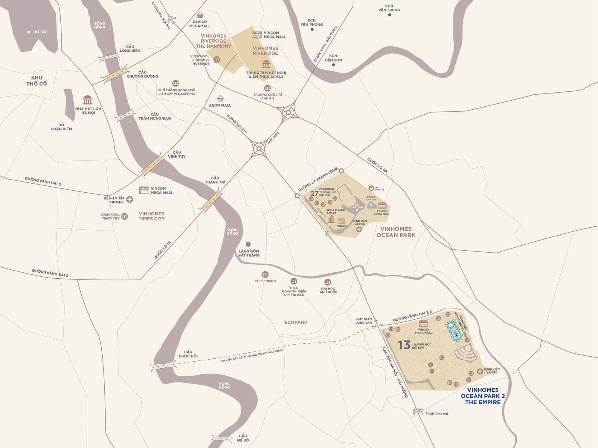 Bên cạnh đó, Hà Nội sắp tới còn có thêm một số cây cầu bắc qua sông Hồng như cầu Trần Hưng Đạo và cầu Mễ Sở. Điều này sẽ giúp cho việc kết nối từ Vinhomes Ocean Park 2 Hưng Yên tới trung tâm thủ đô càng thêm dễ dàng. Trong tương lai, khi hạ tầng giao thông xung quanh Quận Ocean 2 hoàn thiện đồng bộ, tiềm năng tăng giá của Quận Ocean 2 nói riêng và Ocean City Hà Nội nói chung là vô cùng lớn.