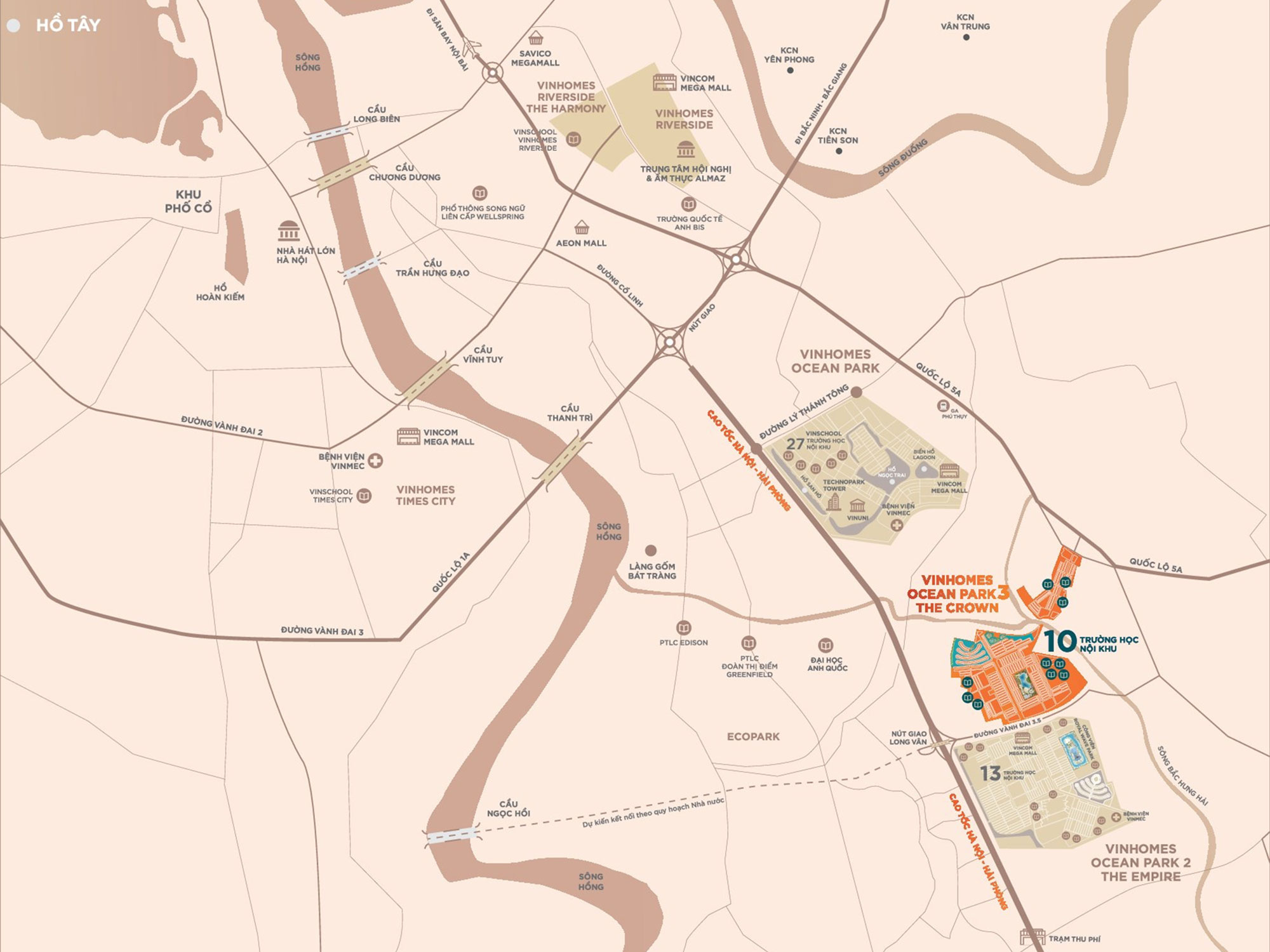 Vinhomes Ocean Park 3 Hưng Yên còn là một trong những khu đô thị hàng đầu tại phía Đông thủ đô tiên phong trong mô hình “Thành phố trong lòng thành phố” đang thịnh hành trên thế giới. Khu đô thị hội tụ đầy đủ trường học Vinschool, trung tâm thương mại Vincom Mega Mall & bệnh viện nghỉ dưỡng Vinmec (Thừa hưởng từ Quận Ocean 2), 11 khu bể bơi phong cách “resort” mang những chủ đề khác nhau, 11 công viên nội khu lấy cảm hứng từ những thủ phủ nghỉ dưỡng 5 châu: Santorini, Barcelona, Caribbean và cả hàng trăm sân thể thao, sân chơi trẻ nhỏ, sân tập dưỡng sinh vv… Đặc biệt, Quận Ocean 3 còn có thêm 2 tòa văn phòng hiện đại và vô vàn khu shophouse, shop thương mại dịch vụ sầm uất nằm dọc theo 2 trục đại lộ Bốn Mùa & đại lộ Hừng Đông, góp phần hình thành nên một khu đô thị sôi động bậc nhất phía Đông Hà Nội.
