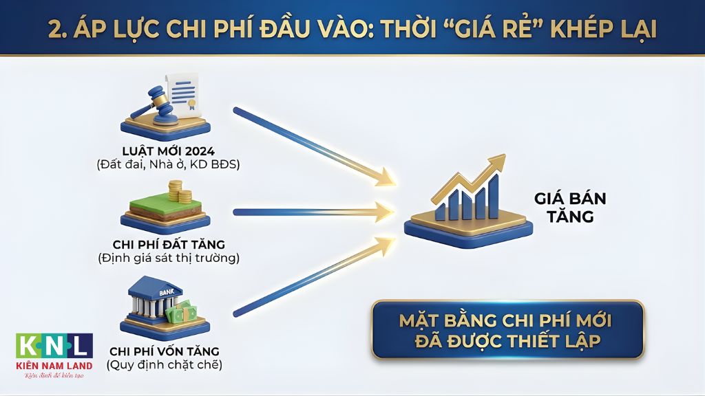 Việc các Bộ Luật mới (Luật Đất đai 2024, Luật Nhà ở 2023, Luật Kinh doanh BĐS 2023) chính thức có hiệu lực từ 01/08/2024 đã tạo ra một “mặt bằng chi phí” hoàn toàn mới cho các chủ đầu tư.