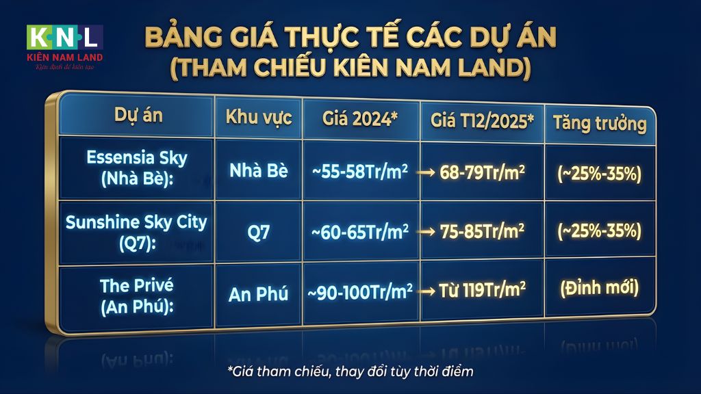 Số liệu thị trường ghi nhận sự tăng trưởng nóng tại các dự án sở hữu pháp lý sạch và tiến độ xây dựng thật. Dưới đây là bảng so sánh mức giá tham chiếu giai đoạn 2024 so với mặt bằng giá hiện tại (Tháng 12/2025):