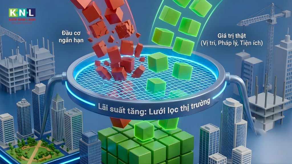 - Lọc bỏ đầu cơ: Lãi suất cao khiến việc đầu cơ ngắn hạn trở nên quá rủi ro. Chỉ những nhà đầu tư có sẵn nguồn vốn ổn định, dòng tiền vững chắc và tầm nhìn dài hạn mới dám xuống tiền.