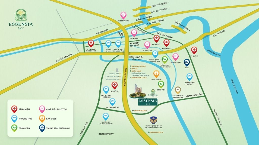 Từ vị trí trung tâm của hệ sinh thái Dragon City, Essensia Sky sở hữu một bán kính vàng kết nối đến mọi tiện ích hàng đầu của Nam Sài Gòn mà không mất thời gian di chuyển: