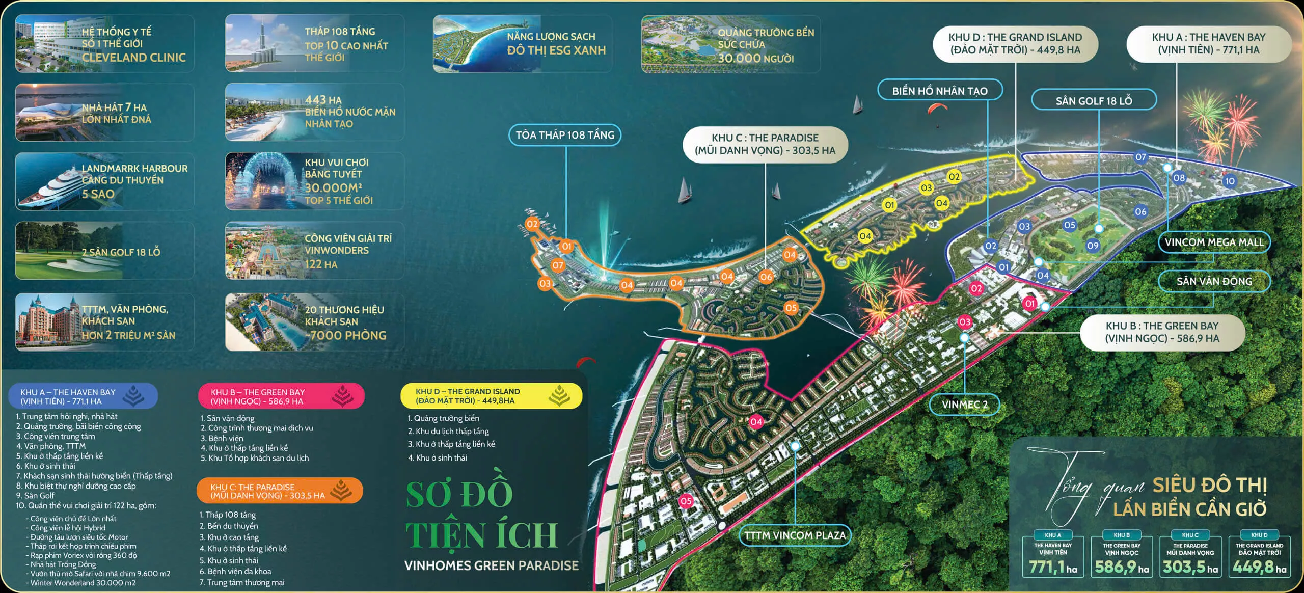Trên tổng diện tích lên đến gần 3.000 ha, đại dự án được quy hoạch như một trung tâm du lịch – giải trí – lưu trú & nghỉ dưỡng lớn nhất khu vực châu Á – Thái Bình Dương. Tự hào khẳng định, Vinhomes Green Paradise là điểm đến quốc tế với hệ tiện ích đẳng cấp 6 sao từ các tiện ích nội khu tiện nghi cho đến tiện ích ngoại khu đắt giá.